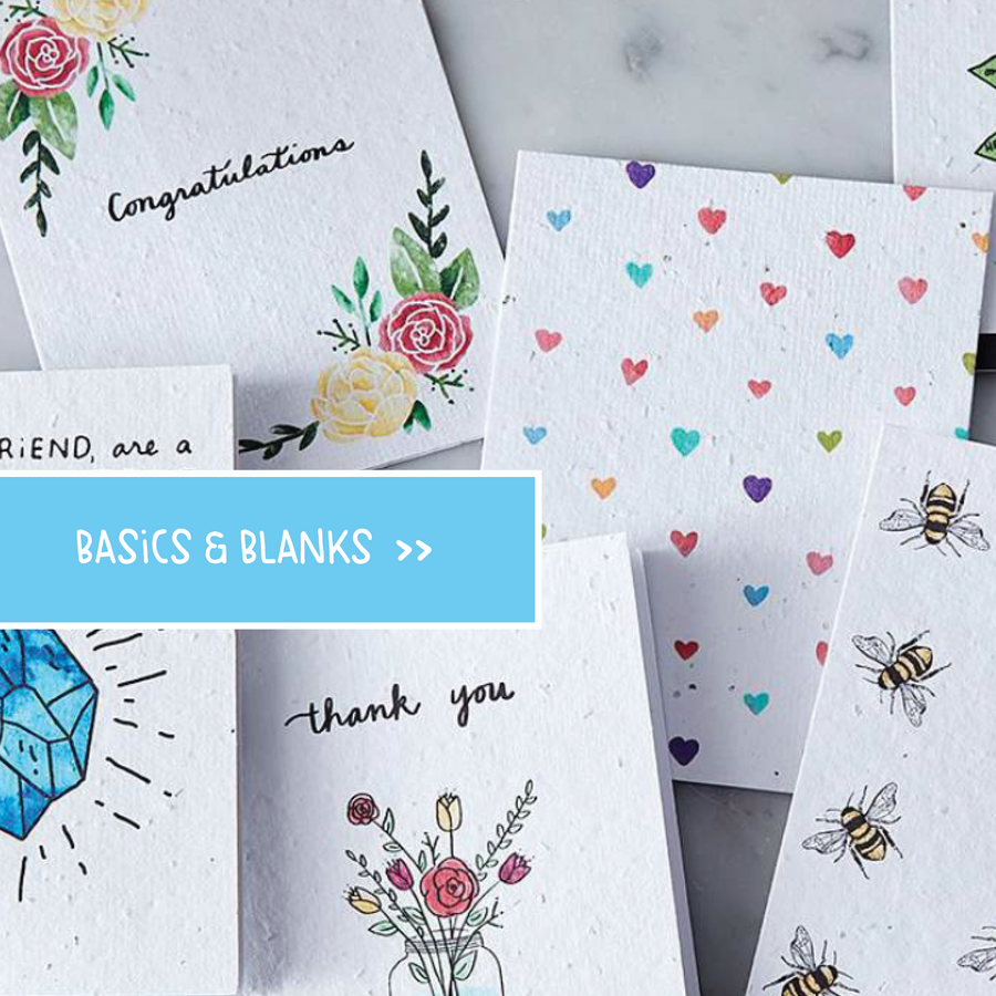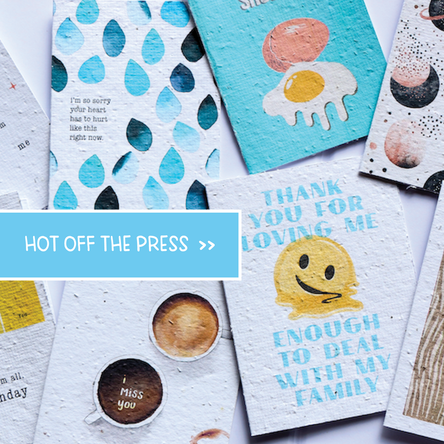 We care about the planet — like, actually. All of our cards are printed with water-based inks on seed paper that is made from recycled materials & can be planted to grow wildflowers! Our envelopes are also made from post-consumer recycled material. We use paper tape and maintain entirely plastic-free packing and shipping practices (to both our customers and retail partners!). learn more on our sustainability page